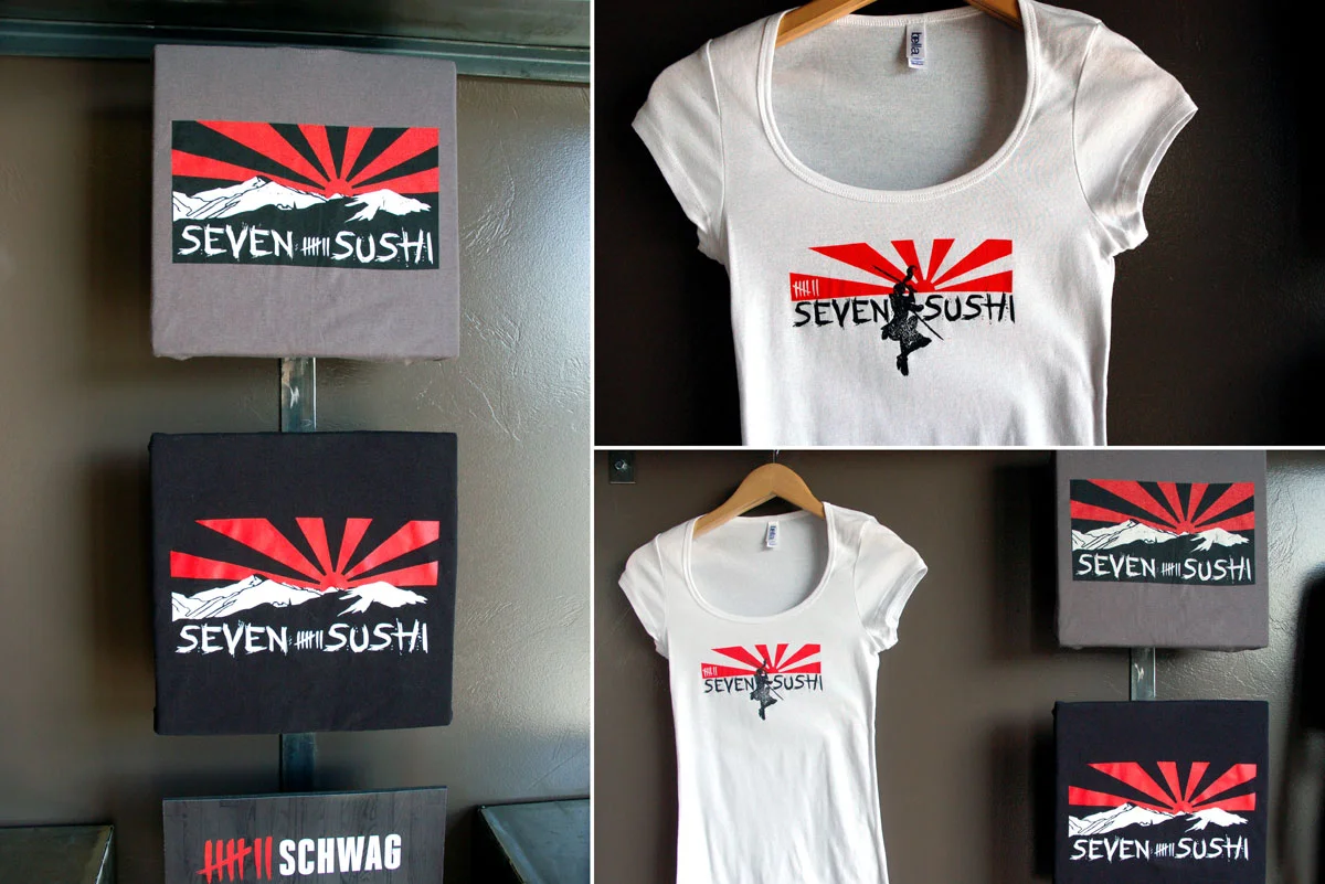 The Seven Sushi restaurant/sushi bar apparel design all revolves around the my choice of the Japanese rising sun image as the main focus. The Rising Sun Flag was originally used by feudal warlords in Japan during the Edo Period (1603–1868 CE). On May 15, 1870, as a policy of the Meiji Government, it was adopted as the war flag of the Imperial Japanese Army, and on October 7, 1889, it was adopted as the Naval Ensign of the Imperial Japanese Navy. It is still used in Japan as a symbol of tradition and good fortune, and is incorporated into commercial products and advertisements.