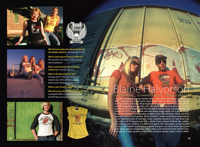 This was a project I worked on during my junior year in the graphic design department at MSU. We were each given an MSU Design School Alumni to contact, consult and then design book spreads to showcase their work. The alumni I was assigned was Blaine Halvorson: designer and co-founder of Junkfood, Inc. https://www.junkfoodclothing.com After speaking with him several times and getting familiar with his brand, he decided to send me a box of Junkfood apparel to use for the project. I found handful of willing Women to adorn the T-Shirts for a photoshoot. My friend and photographer Ryan Wilson took the photos and I organized and coordinated everyone to obtain the images needed to design the layout. This project was very fulfilling, rewarding and lots of fun from start to finish. Blaine was one of the highest profile alumni showcased in the book and I was honored to have the opportunity to work with him.