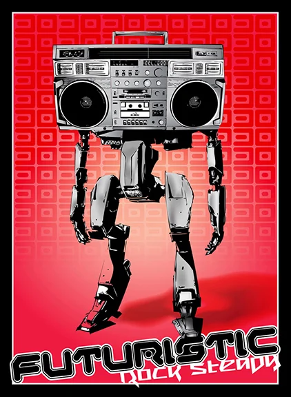 I designed this poster for an art exhibit at the Bozeman High School gallery. The exhibit was a showcase of local graphic designers and their current work, wether it be design or another medium. I wanted to showcase my background in graffiti art with this design. I took a hiphop icon (the boombox) and made it the focus of the concept. I recreated a photo of a boombox in Illustrator and created the robot body in Illustrator to attach the boombox head to. Rock Steady Crew is an American breakdancing and hip hop group which has become a franchise name for multiple groups in other locations. The group's 1983 international hit song "(Hey You)" (from the group's first studio album Ready For Battle) peaked at No. 6 on its fourth week on the UK singles chart and it reached the Top 10 in many European countries. Hence the title: Futuristic Rock Steady.